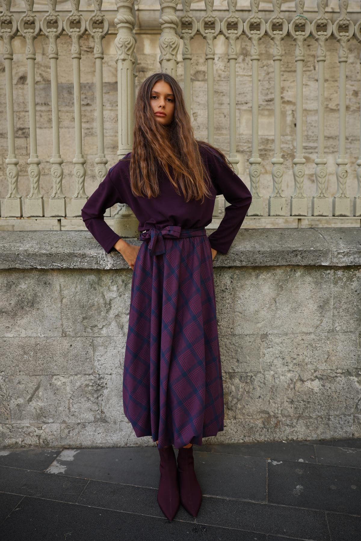 İNCE MODAL BLUZLU BALON EKOSE ETEKLİ ELBİSE