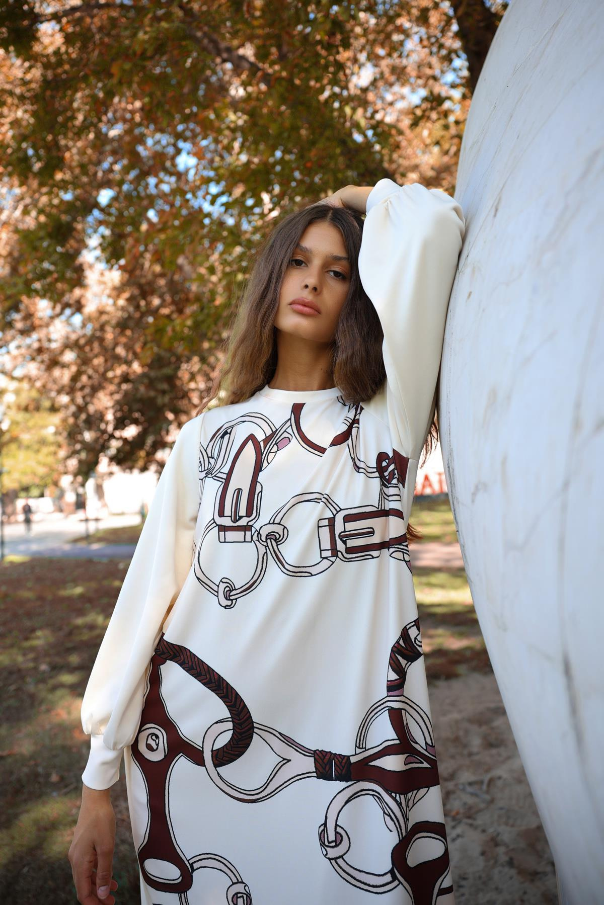 İNCE MODAL ÖNÜ BÜYÜK EL ÇİZİMİ RAIN DESENLİ ELBİSE