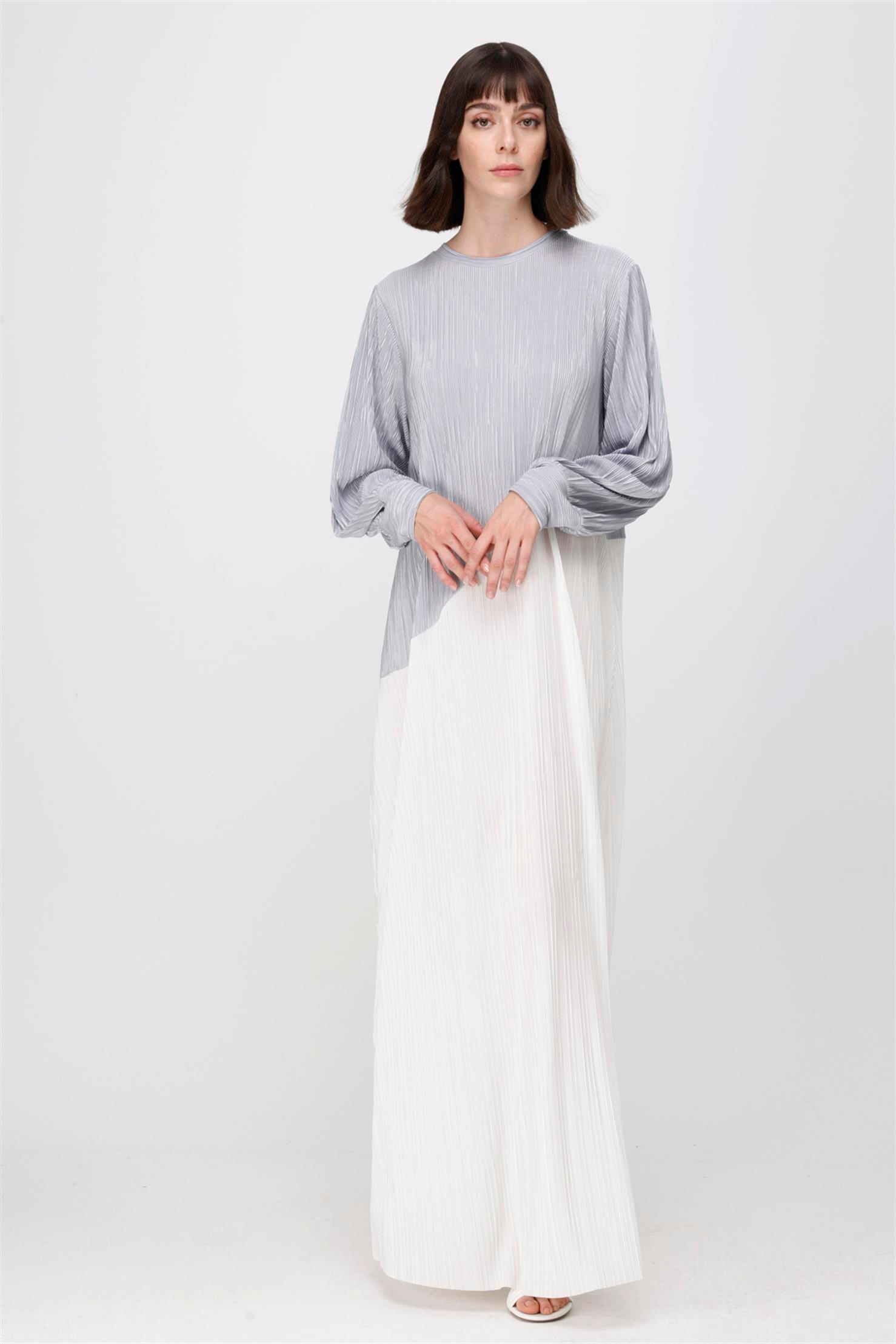 KENDİNDEN KRAŞLI ÇİFT RENK VEREV UZUN ELBİSE