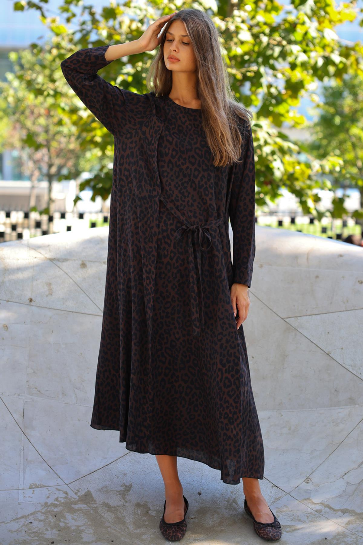 MAROKEN LEOPARLI ÖNDEN BAĞLAMALI ELBİSE